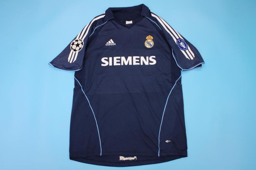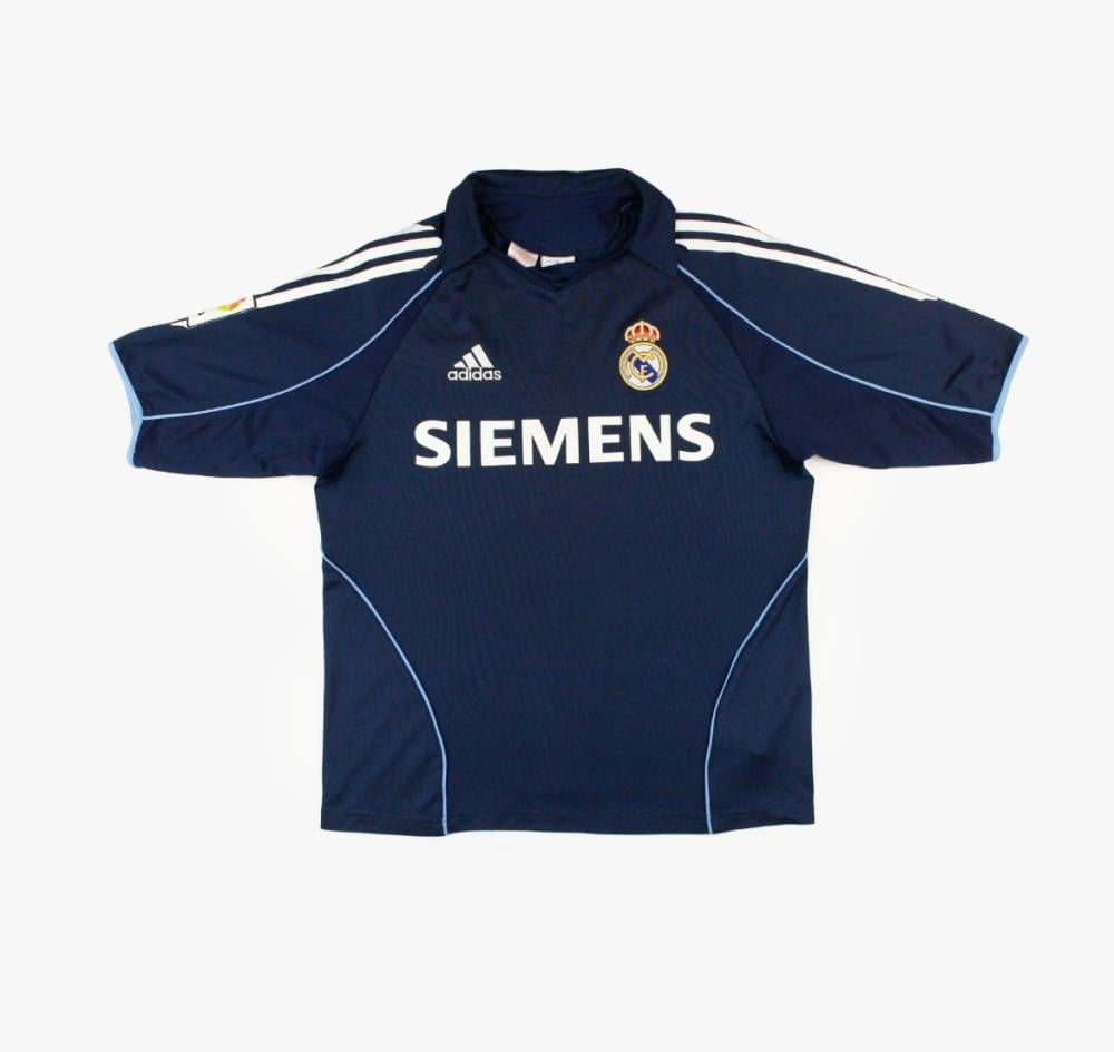 Get ready to relive the golden era with the Real Madrid 2004-05 away jersey! This jersey features a sleek dark blue design with white accents and the iconic adidas 3-Stripes.